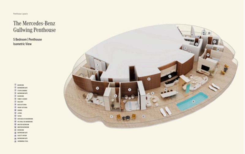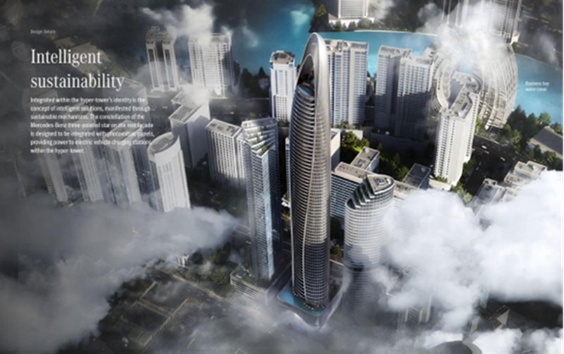 建筑设计:豪宅总高度为341米,共有65层。独特的椭圆形外立面设计灵感来自于奔驰的经典车型,看起来好像太空飞船。奔驰的三叉戟LOGO布满了外立面,格外抢眼。