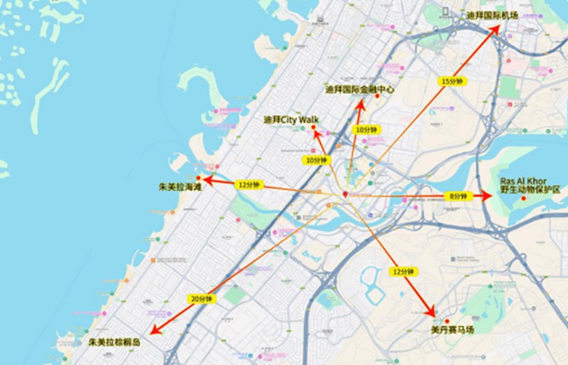 周边配套密集: Jameel 艺术中心、酋长图书馆、Zabeel 体育馆、瑞士国际学校、Latifa 医院、AYA 光影展览馆等。