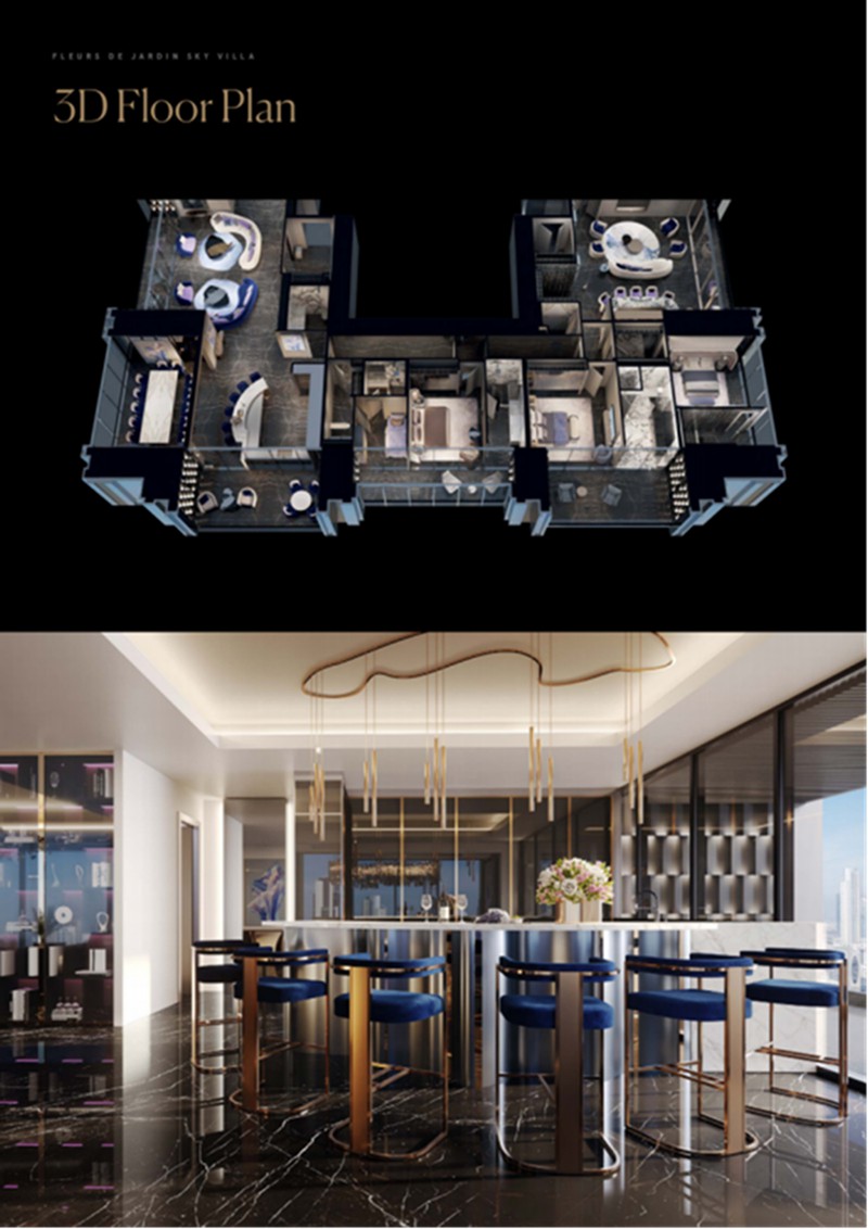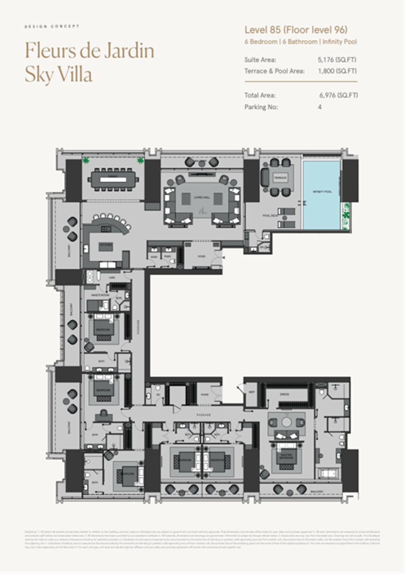花园之花套房 (Fleur de Jardin Penthouse): 6室二厅的半层户型(12套),含保姆、学习间、泳池、健身房和游戏厅,面积 6975 平方英尺 / 646 平方米,起价 3100 万迪拉姆。