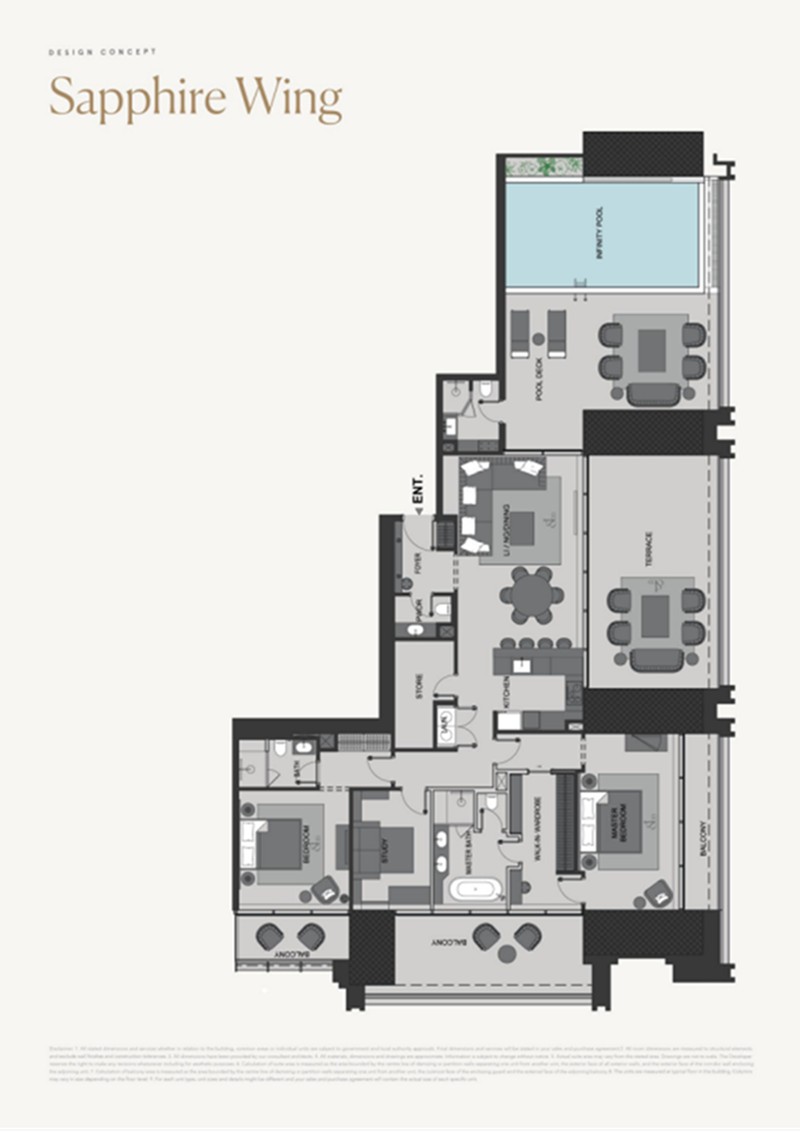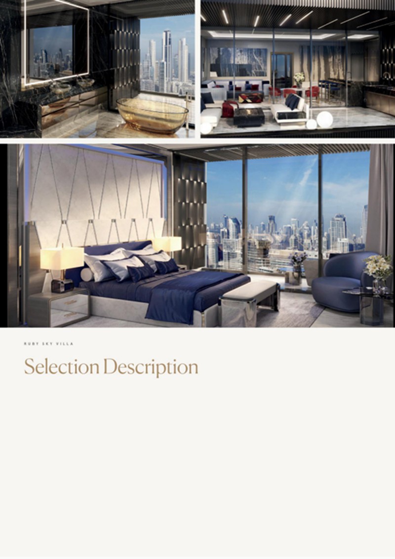 砖石套房 (Diamond Penthouse): 4房二厅户型(12套),含保姆、学习、泳池和健身房,面积 6976 平方英尺 / 646 平方米,起价 3100 万迪拉姆。