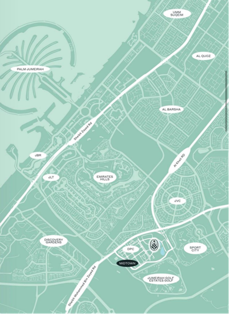 位置: 位于迪拜中部偏南的 IMPZ 国际媒体产业园区(现称 Dubai Production City)内,紧邻迪拜主干线 Sheikh Mohammed Bin Zayed 路。