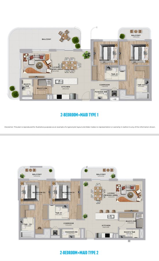 2 房 + 保姆间:69 套,约 154 平方米,起价 335 万迪拉姆