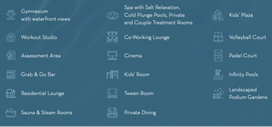 小区俱乐部包含水疗中心、私人理疗室、健身与恢复区(无限泳池、海景健身房)