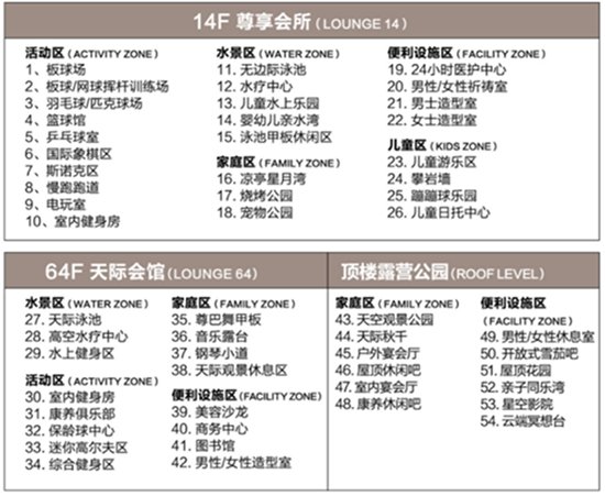 配套设施 (50+项): 提供 50 多个配套设施,打造空中社区公园。