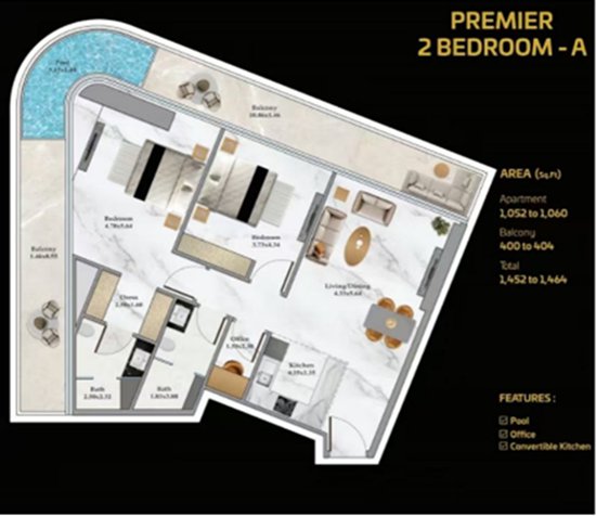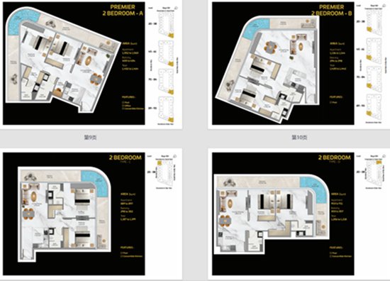 景观特色: “面面俱到”。每一户都有独特无遮拦的景观,包括哈利法塔、迪拜运河、海天盛景和城市车马。