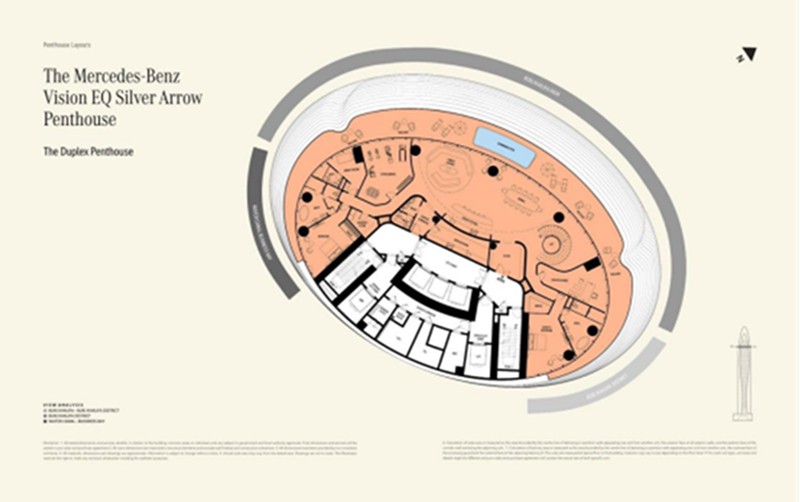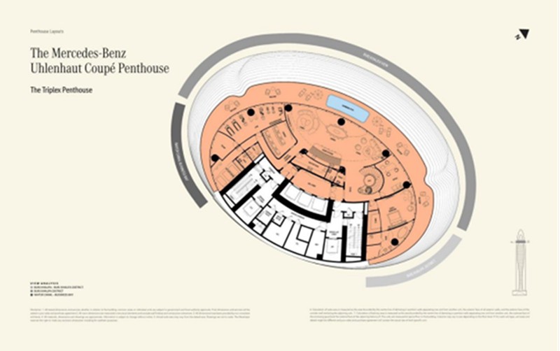 建筑设计:豪宅总高度为341米,共有65层。独特的椭圆形外立面设计灵感来自于奔驰的经典车型,看起来好像太空飞船。奔驰的三叉戟LOGO布满了外立面,格外抢眼。